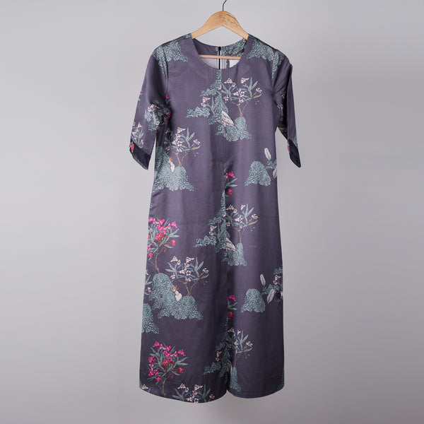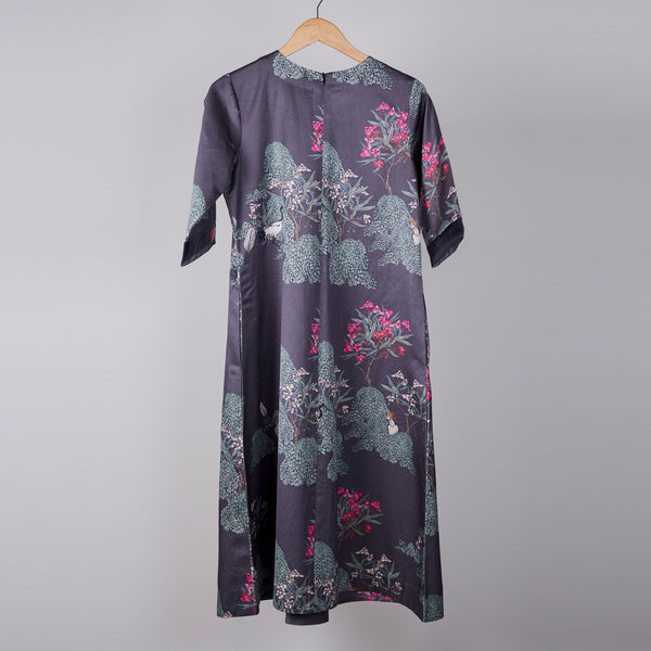 Grey tree printed structured dress with organza and embroidered details at the sleeves.
