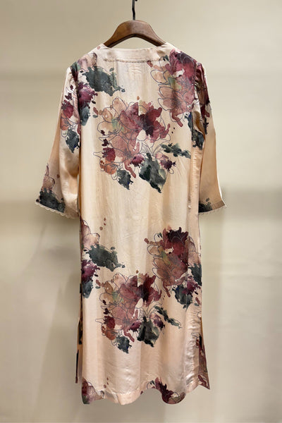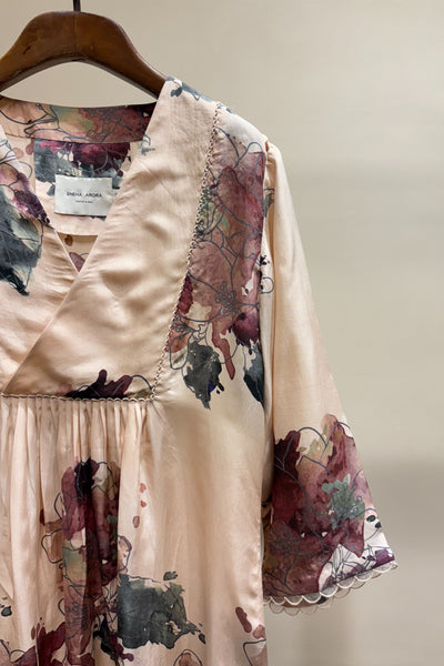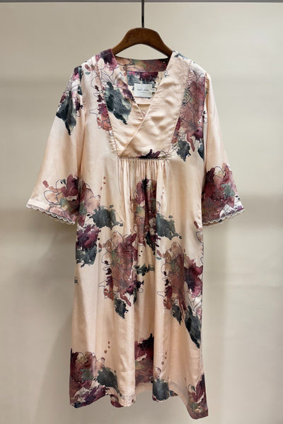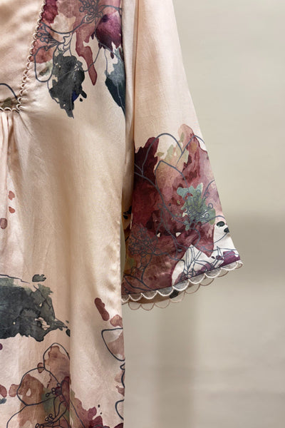Blush peonies print silk dress with scallop detailing at neck & sleeve .
