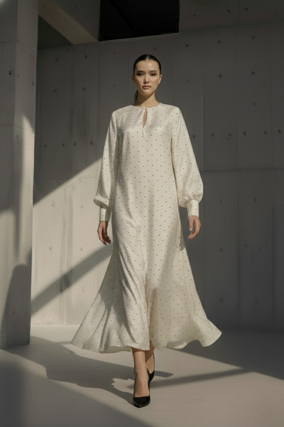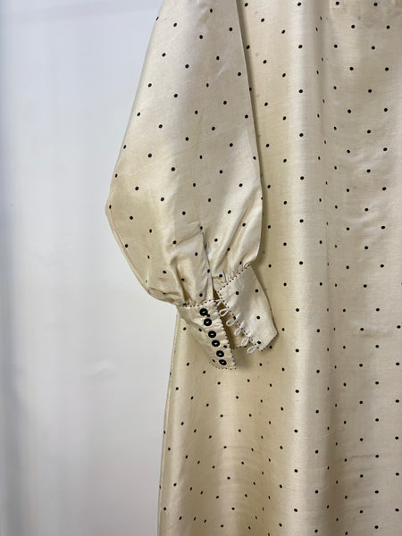Beige and black polka printed nightcap dress in silk.