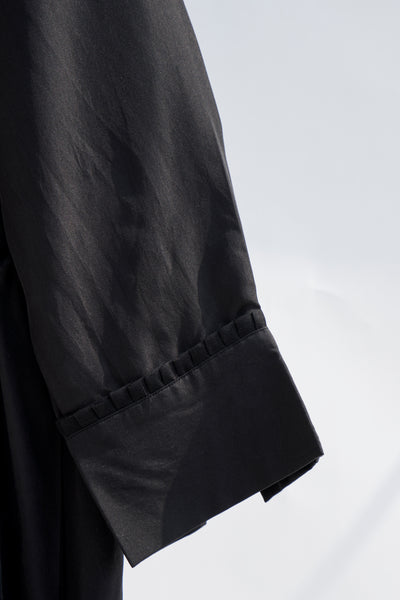 Solid black silk drawstring dress with frill detail at placket and soft collar.