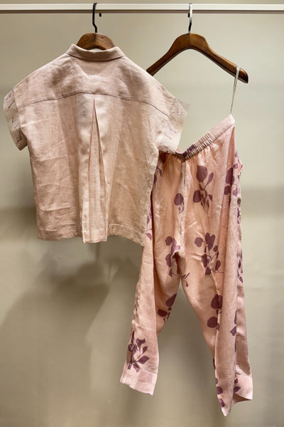 Solid peach shirt with embroidered sleeve hem pared with printed linen trouser .