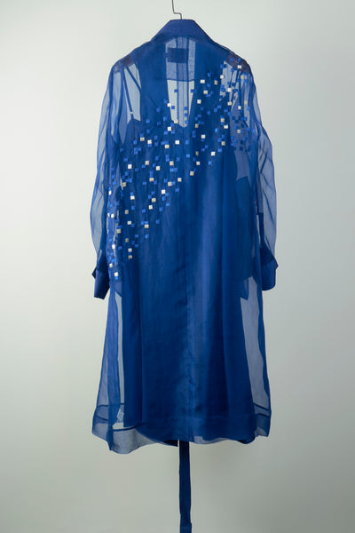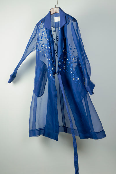Cobalt hand embroidered trench with buckle details and side pockets.