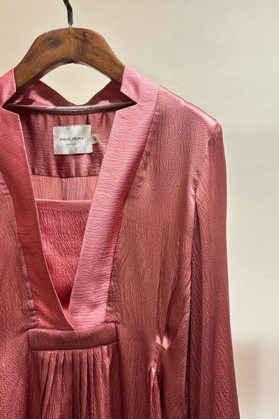 Pink beaten silk evening wear blouse with tie ups at sleeve.
