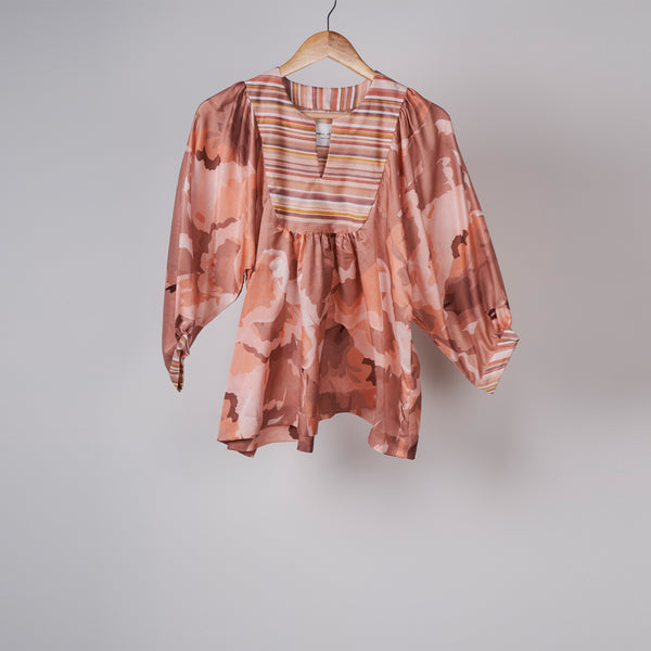Peach and brown abstract printed blouse with striper printed yoke and gathers