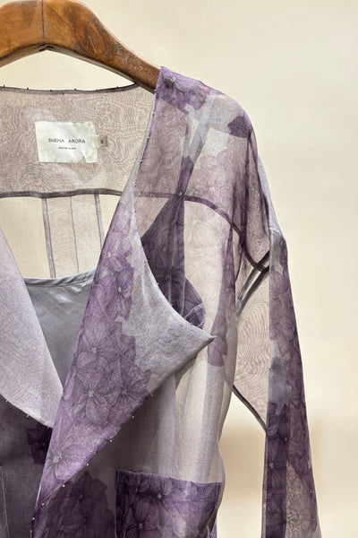 Printed short jacket with tie up belt and patch pockets. Comes with a matching camisole.
