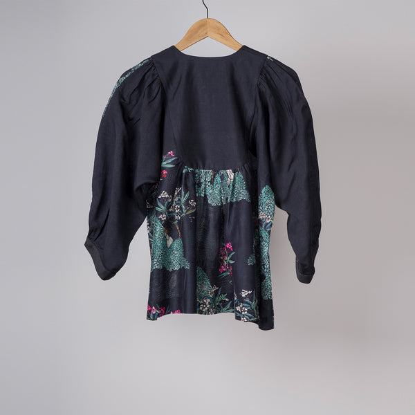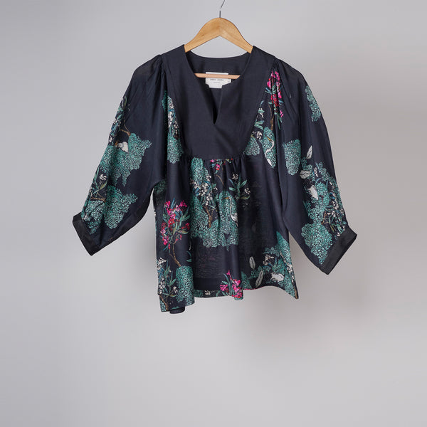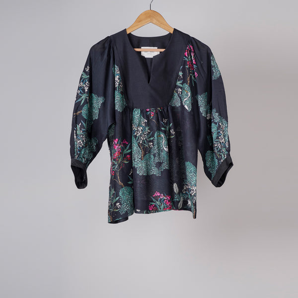 Black tree printed blouse with solid black yoke and gathers