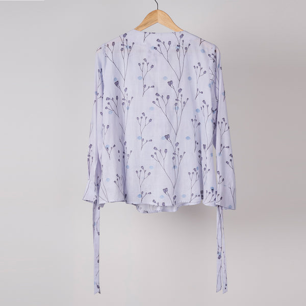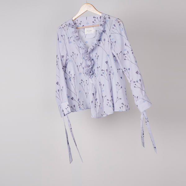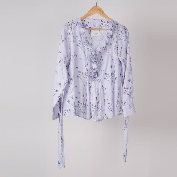 Mauve twig printed top with frill at neck in cotton jamdani