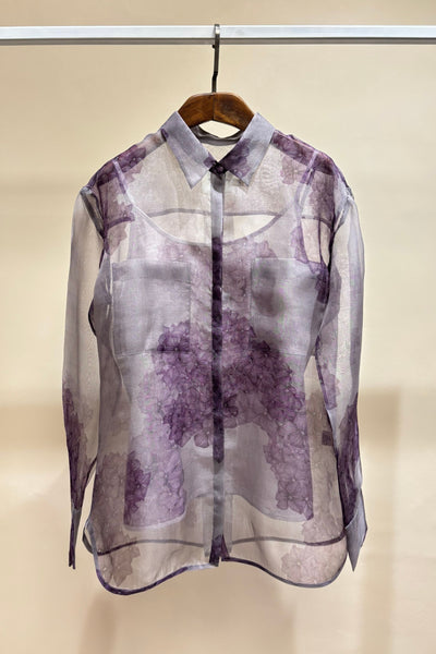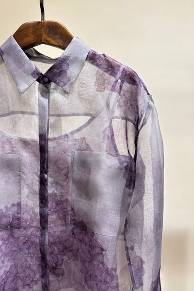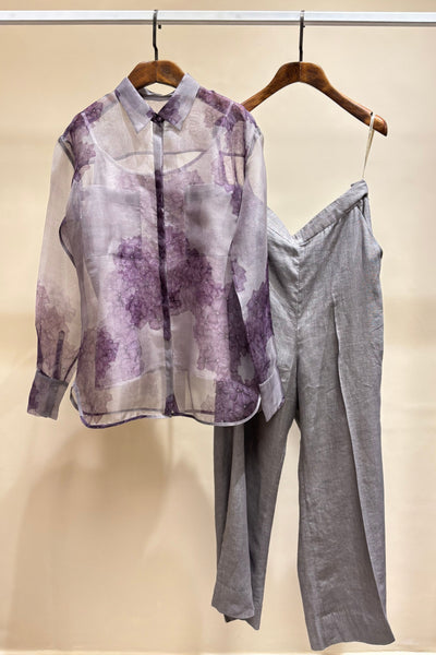 Floral printed organza shirt with embroidery detail at the back (comes with a matching camisole) pared with solid mauve linen trouser.