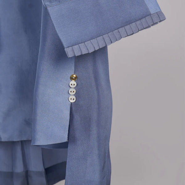 Solid Silk straight fit shirt with running stitch detail on sleeve paired with printed straight fit trousers.