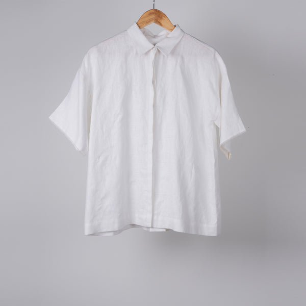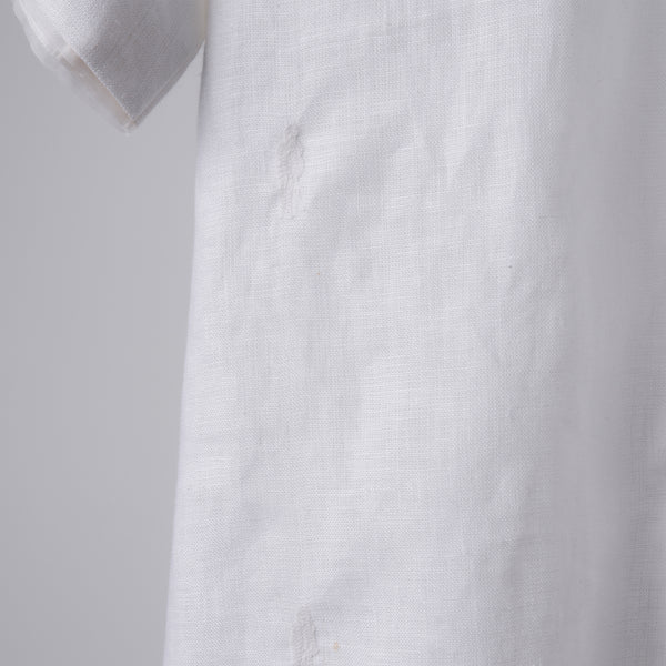 Solid white embroidered linen shirt with drop shoulder and short sleeve .
