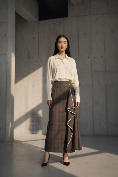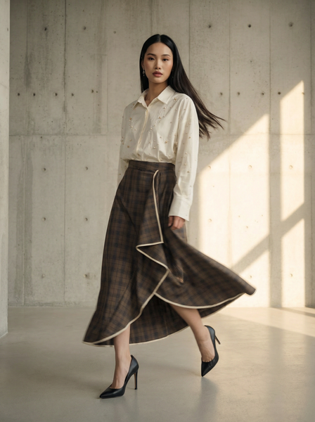 Tan check stir skirt in pure wool
