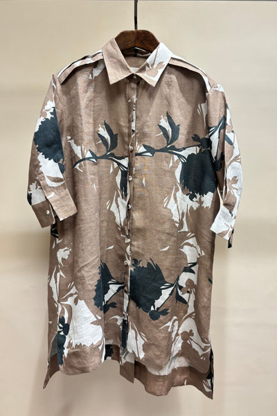 Beige and black floral printed linen shirt with quarter sleeve and up-down hemline .