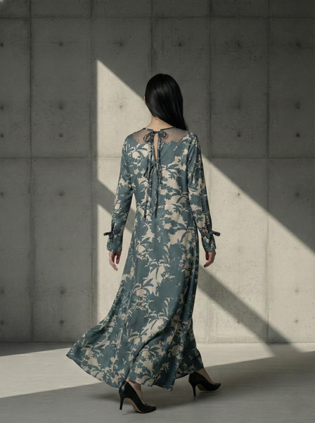 Teal floral printed softcut dress with organza detailing around the neckline.