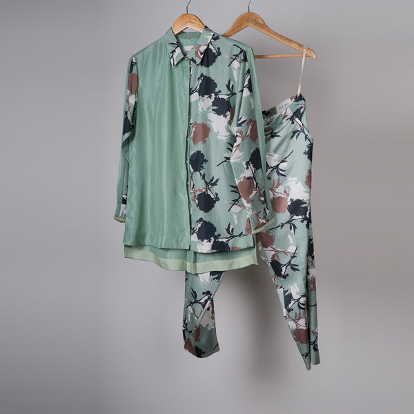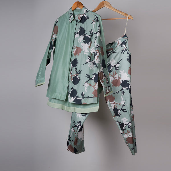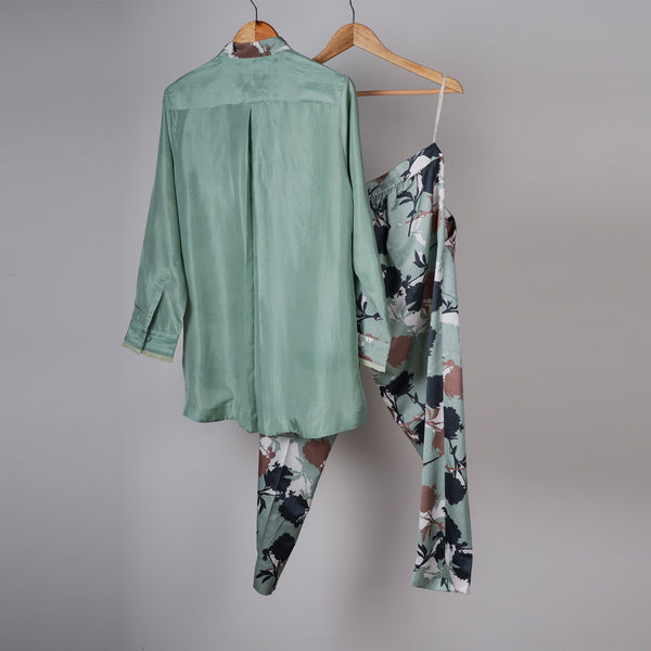 Black and beige floral printed shirt with solid mint back paired with printed straight fit trousers.
