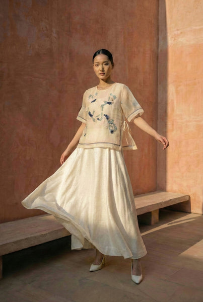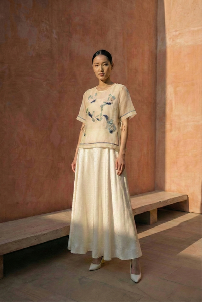 White organza hand embroidered bib top with sleeves, paired with white silk polka flared skirt set.